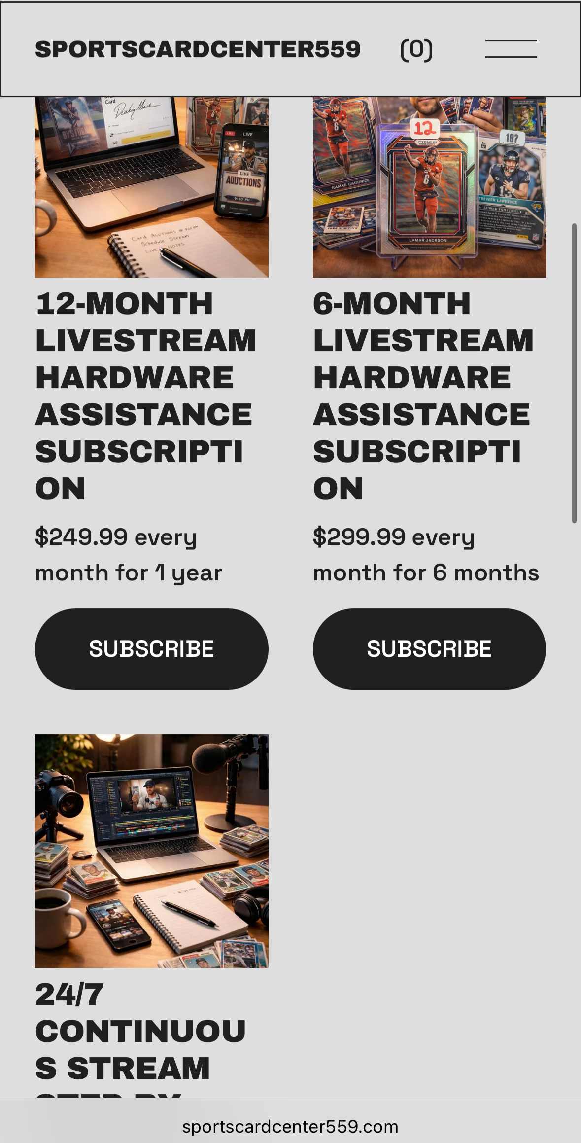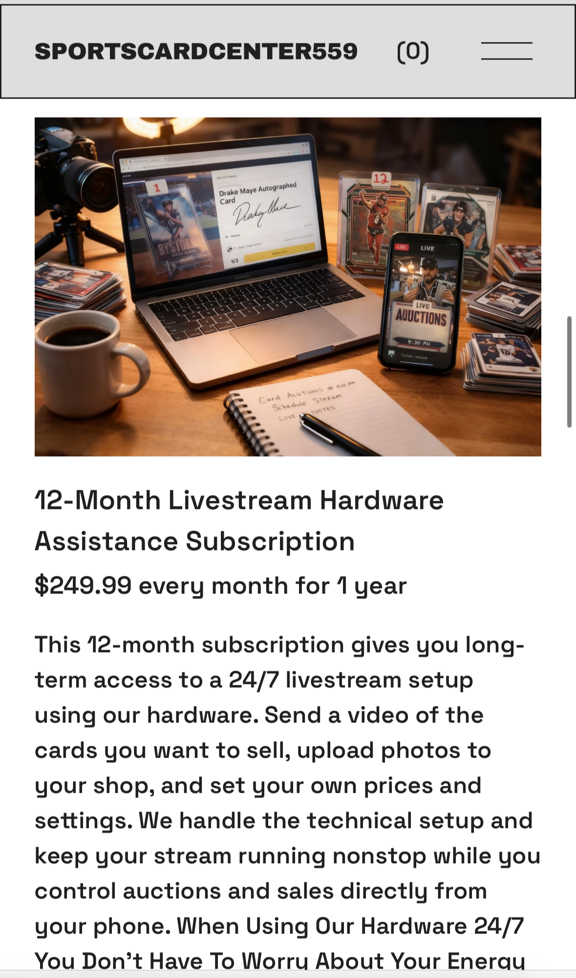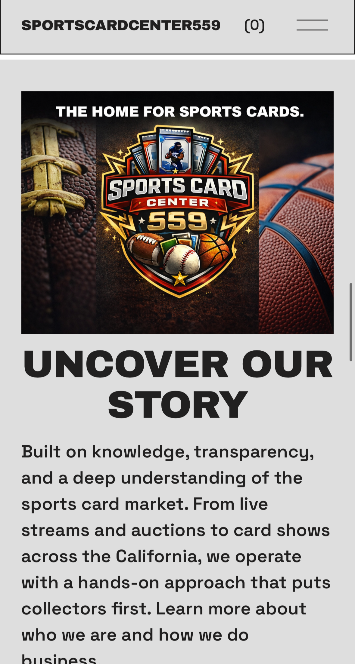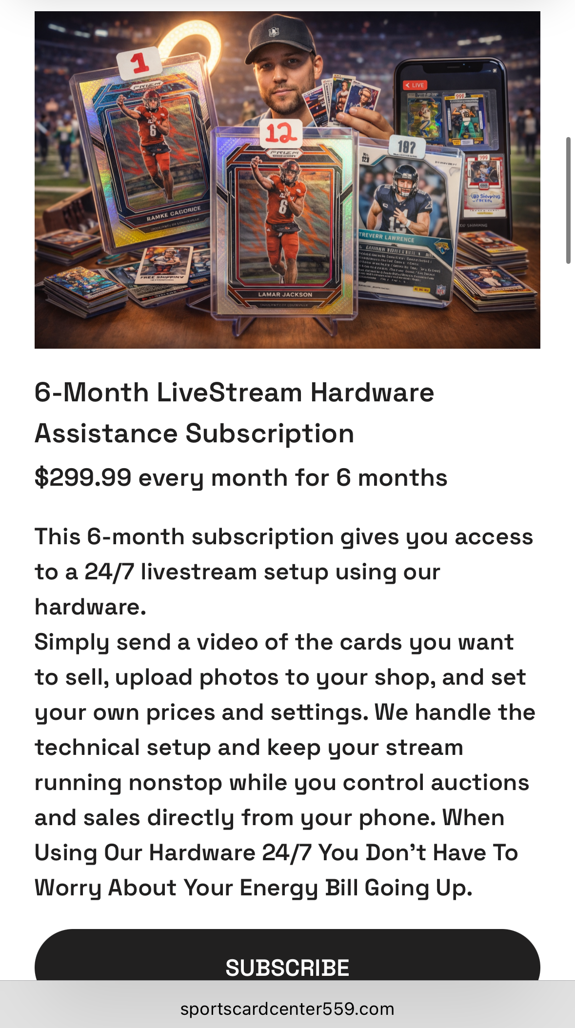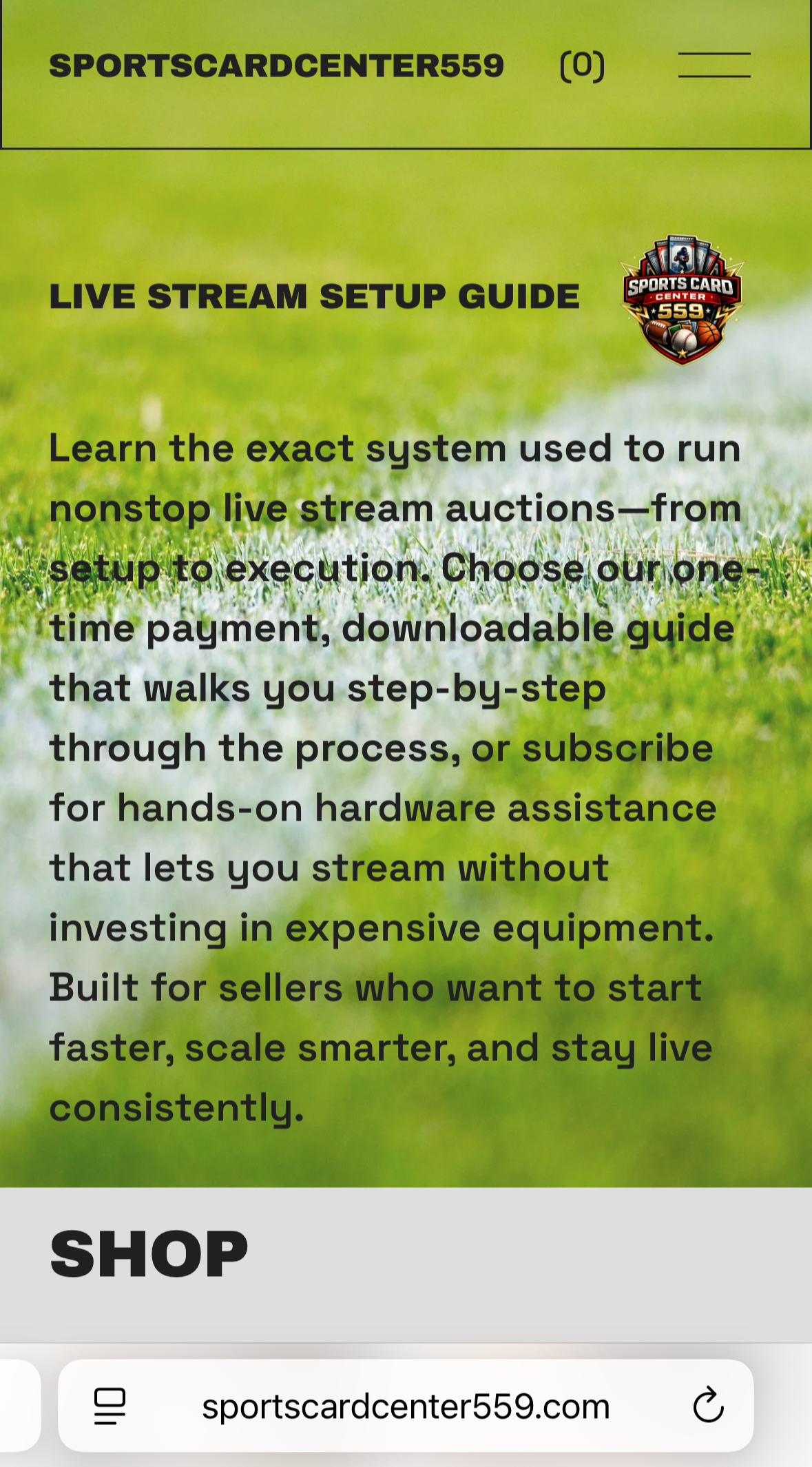 BASH Creative Co. designed and developed a complete e-commerce website for SportsCardCenter559, a brand focused on sports card auctions and livestream selling. The goal was to create a clean, modern platform that clearly explains the company’s services while allowing users to easily purchase digital products and subscription-based livestream solutions.